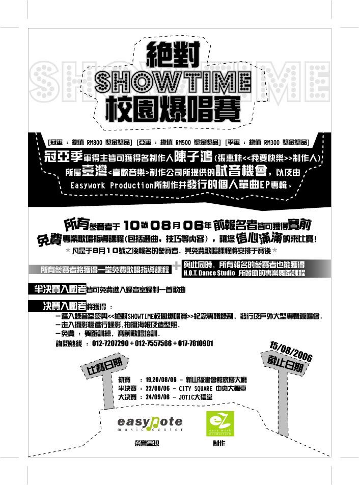 这几天。。超级不够睡的。。唉。。做工都没什么精神。。当中也帮了老师做了一张宣传歌唱比赛的。。传单吧,等下post上来给大家看看。。我还蛮喜欢的。。呵呵。。1个小时内变出来的咧,不要玩玩。。。哈哈