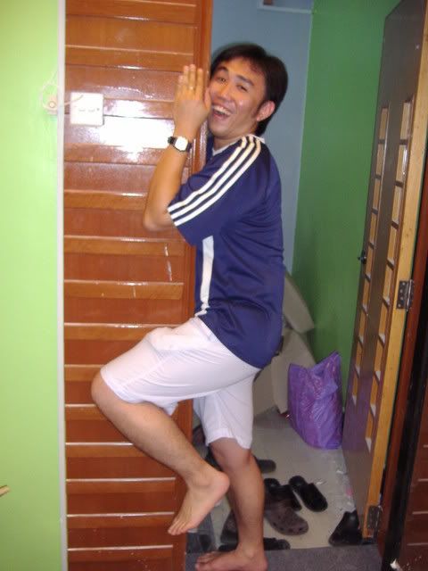 请看右图。为人师表,竟然能摆出那么高超的姿势拍照?哇哈哈 他所在位置就是新的eznote大门,旁边青色的是墙壁,他抱着的是木色的木门,在后面还摆放了一个紫色的纸带,里面到底藏着什么惊人的东西呢?我也不知道。还有地上有很多双各式各样的鞋子。还有一双不知道是不是鳄鱼牌的鳄鱼朱古力鳄鱼大头鞋。各位,看到了吗?地板的地毯是灰色的!背后就是楼梯了,墙上是灰色的。对了,青色的墙是珍珠漆哦,贵的那种。还有身上穿的是蓝色+白色线条的上衣,佩着白色的即膝裤,很好的颜色搭配。还有介于手表和灯开关的位置,有着一片的白光,本人相信应该不是鬼火。而是相机的散光灯所造成的一道白光。可见的相机的闪光功能是不错的。哇哈哈哈哈哈哈哈哈哈哈哈哈哈哈哈哈哈哈哈哈哈哈哈哈哈哈哈哈哈哈哈哈哈哈。