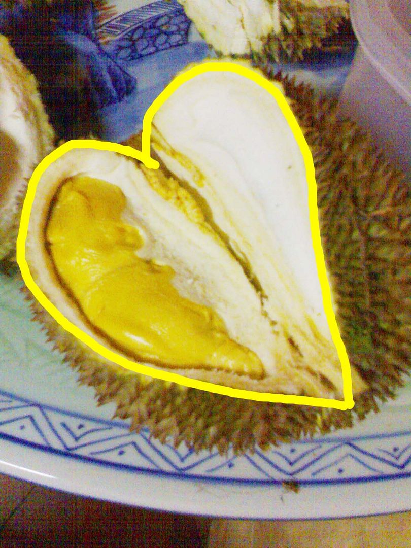 那天吃着吃着,就看到了这颗榴莲~!哇~!爱心榴莲哩~!!!!!!Good! 谢谢每次带很多好榴莲又没有打药的榴莲给我们吃的阿华uncle~~~~~~~~他一直强调说,外面很多榴莲都是黑心打药榴莲~!还是自己果园的最好~!安全,可靠,耐吃~!~~ 哈哈!赞啦~~~!