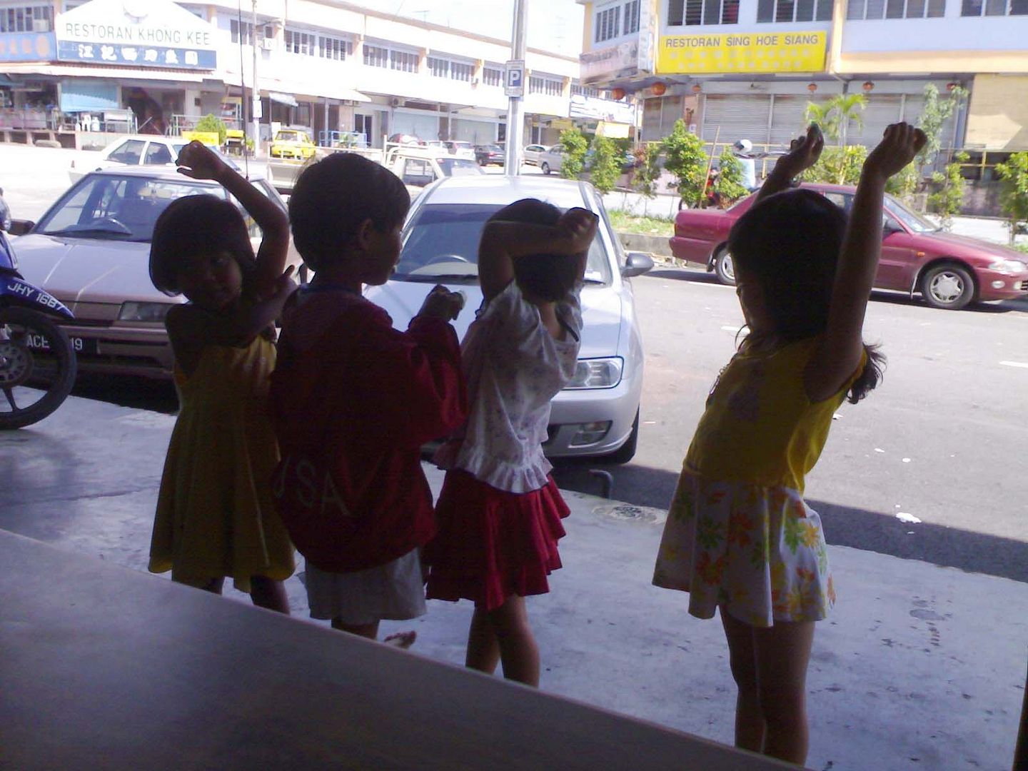 大家看下,这几个小孩是在玩警察搜身的游戏吗?他们是隔几间车衣厂的工人的孩子。从左边开始哪个叫阿Yin, 然后Lisa, Lily, 还有Lulu. 年龄大概介于7到5岁。她们每天都会腻在一起玩耍,演戏。是的,她们很喜欢演戏。而且还有编导和导演。黄色衣的Lulu就是他们的导演。